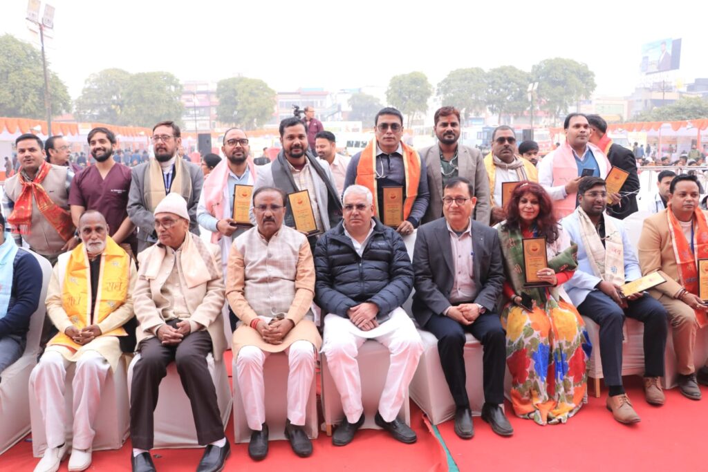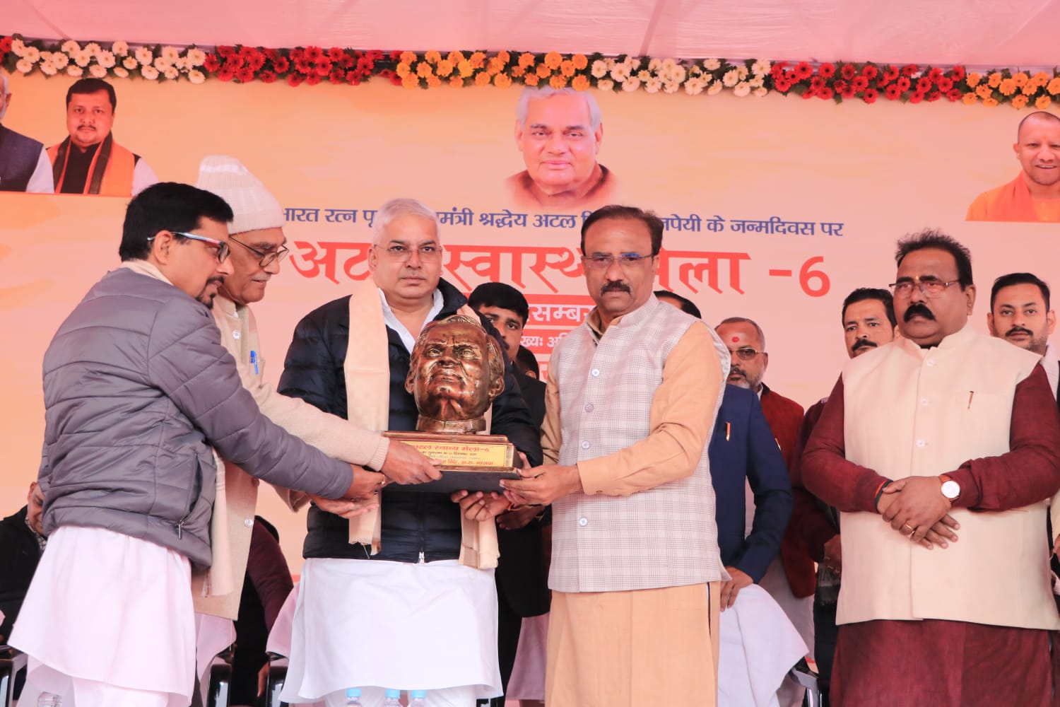 लखनऊ 21 DEC 2025 भाजपा वरिष्ठ डॉक्टर नीरज सिंह के संयोजन में आयोजित दो दिवसीय अटल स्वास्थ्य मेला-6 के समापन अवसर पर मुख्य अतिथि उत्तर प्रदेश सरकार के राज्य मंत्री मयंकेश्वर शरण सिंह और सदस्य विधान परिषद मुकेश शर्मा ने स्वास्थ्य मेले में अस्पतालों के स्टॉल लगाकर निशुल्क स्वास्थ्य सेवाएं दे रहे सभी चिकित्सकों को अंग वस्त्र और स्मृति चिन्ह भेंट करके सम्मानित किया। स्वास्थ्य मेले में उपचार के लिए आए सभी जरूरतमंदों को ठंड से राहत प्रदान करने के लिए सभी को कंबल भी वितरित किये।