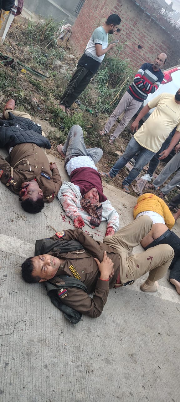 महराजगंज दबिश से लौट रहे पुलिसकर्मियों की वाहन का भीसड़ दुर्घटना दुर्घटना में एक दरोगा की मौत, पाँच घायल पेड़ से टकराई पुलिसकर्मियों की स्कॉर्पियो कुशीनगर में दबिश देकर वापस गोरखपुर जा रही थी गोरखपुर पुलिस घायल पुलिसकर्मियों को बीआरडी मेडिकल कॉलेज में कराया गया भर्ती इलाज के दौरान गोरखपुर के रामगढ़ ताल थाने में तैनात दरोगा संतोष कुमार की मौत एसआई रमेश चंद, संतोष कुमार, महिला दरोगा गीता, चालक व अन्य दो सदस्य गाड़ी में थे सवार दुर्घटना में स्कार्पियो का अगला हिस्सा बुरी तरह क्षतिग्रस्त सूचना पर जिले के आलाधिकारी पहुँचे बीआरडी श्यामदेउरवा थाना क्षेत्र के कतरारी चौकी के पास हुआ हादसा