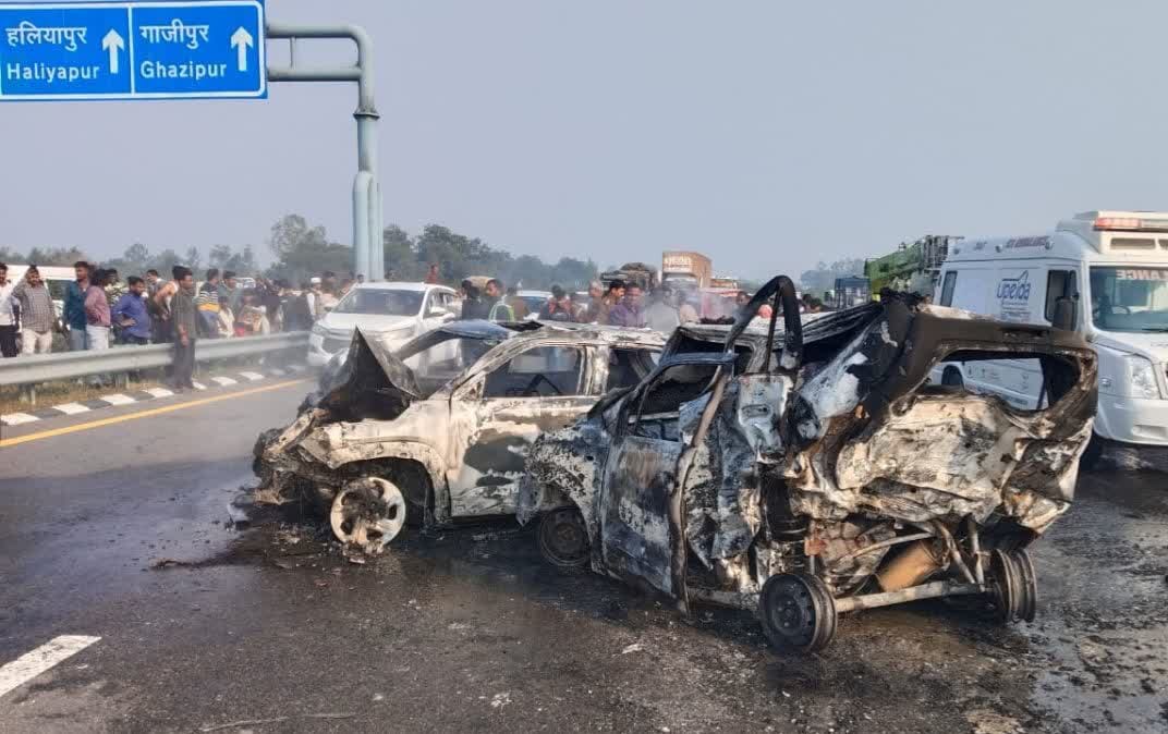 बाराबंकी उत्तर प्रदेश के बाराबंकी जिले में बुधवार दोपहर पूर्वांचल एक्सप्रेस-वे पर एक भीषण सड़क हादसा हो गया। खड़ी वैगन आर कार में पीछे से तेज रफ्तार ब्रेज़ा ने जोरदार टक्कर मार दी। टक्कर के बाद दोनों कारों में आग लग गई, जिसमें 5 लोगों की मौत हो गई, जबकि 4 लोग गंभीर रूप से घायल हो गए। घायलों को तुरंत नजदीकी अस्पताल में भर्ती कराया गया।