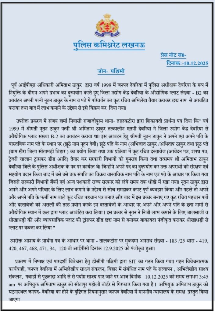 लखनऊ के तालकटोरा थाने के प्रभारी ने नूतन ठाकुर को फ़ोन कर सूचना दी कि कुछ माह पूर्व देवरिया में दर्ज मुकदमे में पुलिस ने अमिताभ ठाकुर को गिरफ़्तार किया है और उन्हें देवरिया ले जाया जा रहा है।नूतन का कहना है कि देवरिया एफआईआर प्रकरण में आईओ के बारे में पता करने की कई बार कोशिश की ताकि अपना पक्ष रख सकें लेकिन कोई जानकारी नहीं दी गई और पूरे मामले को रहस्य बनाकर रखा गया।इस एफ़आईआर में नूतन ठाकुर को भी आरोपी बनाया गया है।