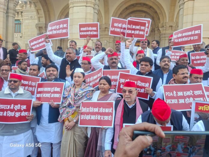 विधानसभा सत्र के पहले दिन इंडिया गठबंधन का जनता के मुद्दों पर जोरदार प्रदर्शनप्रदेश में बेरोजगारी – महंगाई चरम पर, किसानों को बोरी का वजन घटाकर धोखा दिया जा रहा, आवाज सुनी नहीं जा रही – आराधना मिश्रा मोना, नेता विधानमंडल दल कांग्रेस SIR में धांधली कर लोगों के वोट के अधिकार को छीना जा रहा – आराधना मिश्रा मोना, नेता विधानमंडल दल कांग्रेस प्रदेश में स्वास्थ्य सेवाओं का बुरा हाल,BJP सरकार को लोगों के स्वास्थ्य की चिंता नहीं, सरकार का पूरा तंत्र सिर्फ झूठे प्रचार और धार्मिक ध्रुवीकरण में व्यस्त- आराधना मिश्रा मोना, नेता विधानमंडल दल कांग्रेस प्रदेश के जनता से जुड़े मुद्दे बेरोजगारी, महंगाई, स्वास्थ्य बदहाली, और SIR में धांधली में को लेकर कांग्रेस – समाजवादी पार्टी समेत इंडिया गठबंधन के सभी दलों ने संयुक्त रूप से विधानसभा स्थित चौधरी चरण सिंह जी की प्रतिमा के समक्ष विरोध प्रदर्शन किया